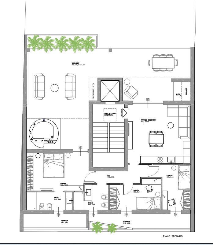 Il vero punto di forza di questa residenza è il rapporto con l’esterno, dominato da una straordinaria terrazza a livello di 77 mq. Questo spazio immenso rappresenta una vera estensione della casa all’aperto, ideale per allestire una zona lounge, un’area pranzo esterna o un solarium privato in totale privacy.